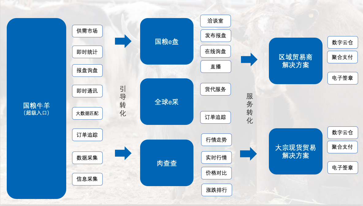以大数据分析强化服务功能。建立牛羊肉行业数据中心,通过制定数据清洗标准、数据质量标准、数据映射标准、数据对齐标准,建立数据加工流水线,形成一系列行之有效的行业数据分析模型,为行业数字化转型提供基础性工具支持。通过“全球e采、技术服务、大数据、仓储物流、供应链金融、品牌服务”六大服务内容,为区域贸易商和大宗现货贸易商提供解决方案。