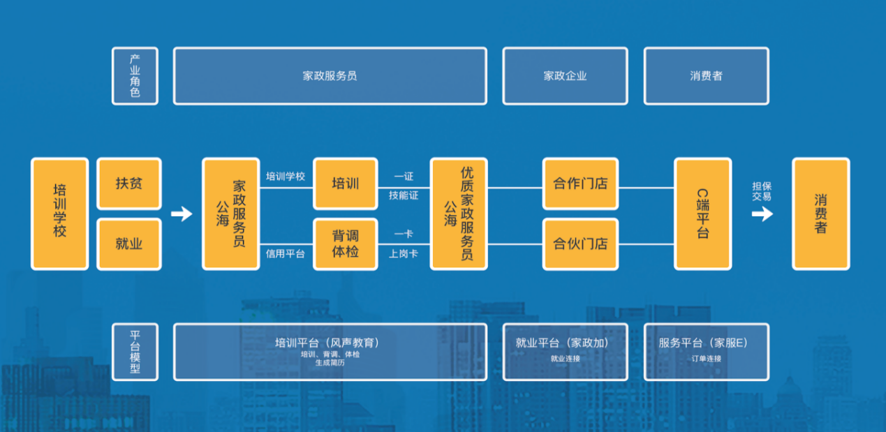 坚持问题导向,以标准化赋能家政全产业链。针对家政企业小、散、乱,服务不规范,家政人员职业素养不够等问题,斑马家政云聚焦家政人员技能提升、家政企业高效经营、用户放心消费三大产业链关键节点,构建上中下游全链条发展模式,系统推进行业转型升级。在上游端,规模化培训输出高技能、高素质家政人员;在中游端,积极促进家政企业、家政行业协会、职业培训学校数字化转型;在下游端,大力建设诚信体系、放心消费环境、社区精品家政工作站。研发推出智慧家政体系——“风声”互联网+双师家政服务线上直播培训平台、“家政加”企业SaaS平台、“家服e”家政信用体系平台等产品,形成高效、有序、持续优化的家政消费链路,发挥互联网赋能家政消费升级的叠加倍增效应。