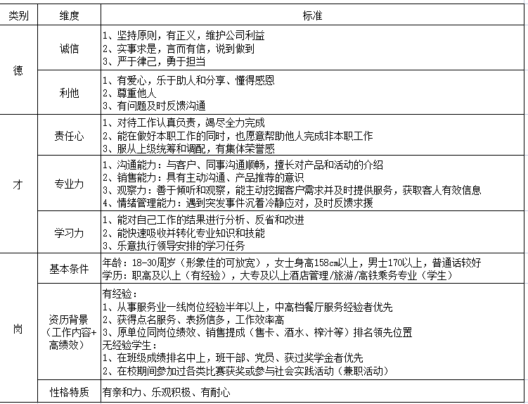 建立岗位选人标准。一是制定岗位用人标准。基于浙江隆聚餐饮集团未来战略需求及组织能力,从“德”、“才”、“岗”三个维度去衡量人才、考核人才,建立岗位人才画像(人才标准),解决招人标准不清晰问题。二是明确招聘渠道标准。基层人员采用内部推荐、专业技术学校招聘方式,高级管理人员采用挖猎方式,管培生采用本科院校招聘方式。三是严把“入口”标准,新人招选通过简历关、面试关、入职关(新员工带训期)、集训关(新员工集训期)、绩效关(试用期)五关,经过“漏斗式”层层筛选,留下最优秀的人。