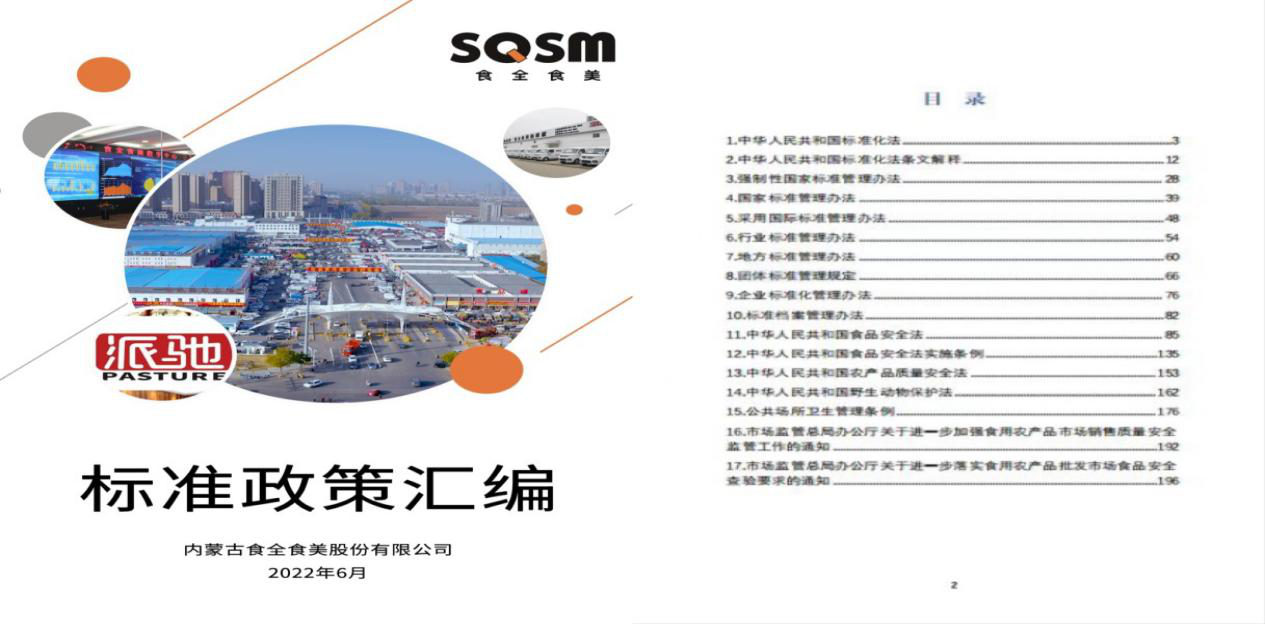 搭建标准化政策信息库。建立标准化信息库和国家标准化法律法规、政策信息库。对现行的农产品流通行业相关标准搜集整理,共收集国家标准463项,行业标准305项,地方标准30项。按照基础标准、技术标准、管理标准、环境与安全标准等进行分类,通过微信群进行专项指导,参加标准化专业培训,提升全员标准化意识。举办2021年“10.14世界标准日主题宣传活动暨内蒙古食全食美股份有限公司国家级服务业标准化试点(商贸流通领域)启动仪式”,为公司高层人员开展标准化培训,提升对标准化和试点工作的认识。